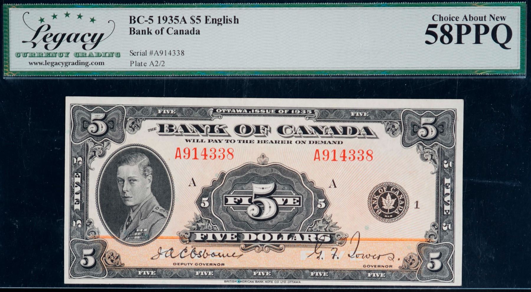 1935 $5 BC-5 #A914338, Legacy Choice About Uncirculated-58PPQ. A bright example.