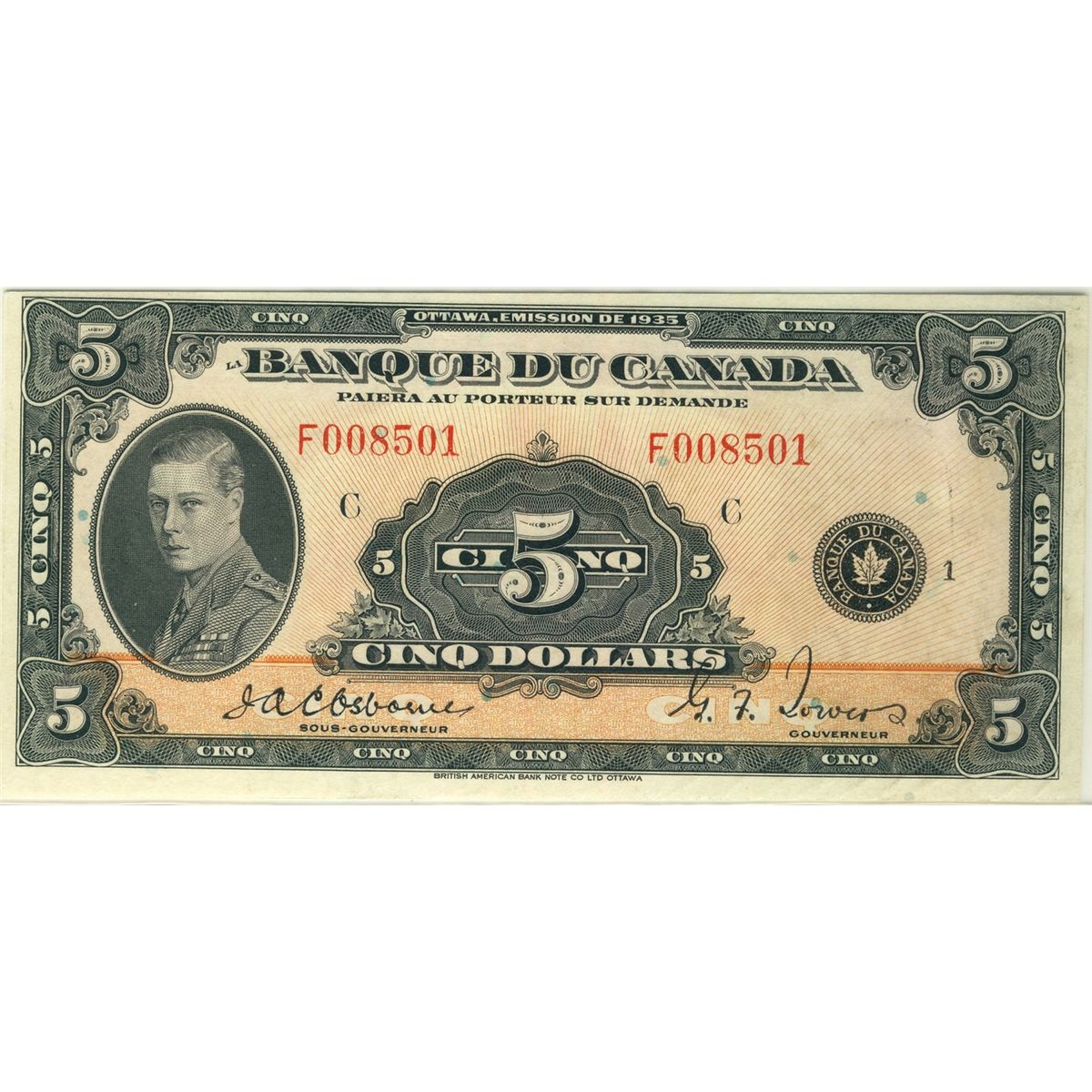 1935 $5 BC-6 #F008501. PCGS UNC62. Crisp and bright with vibrant colours. A very rare note in this top condition. Worth a premium bid.