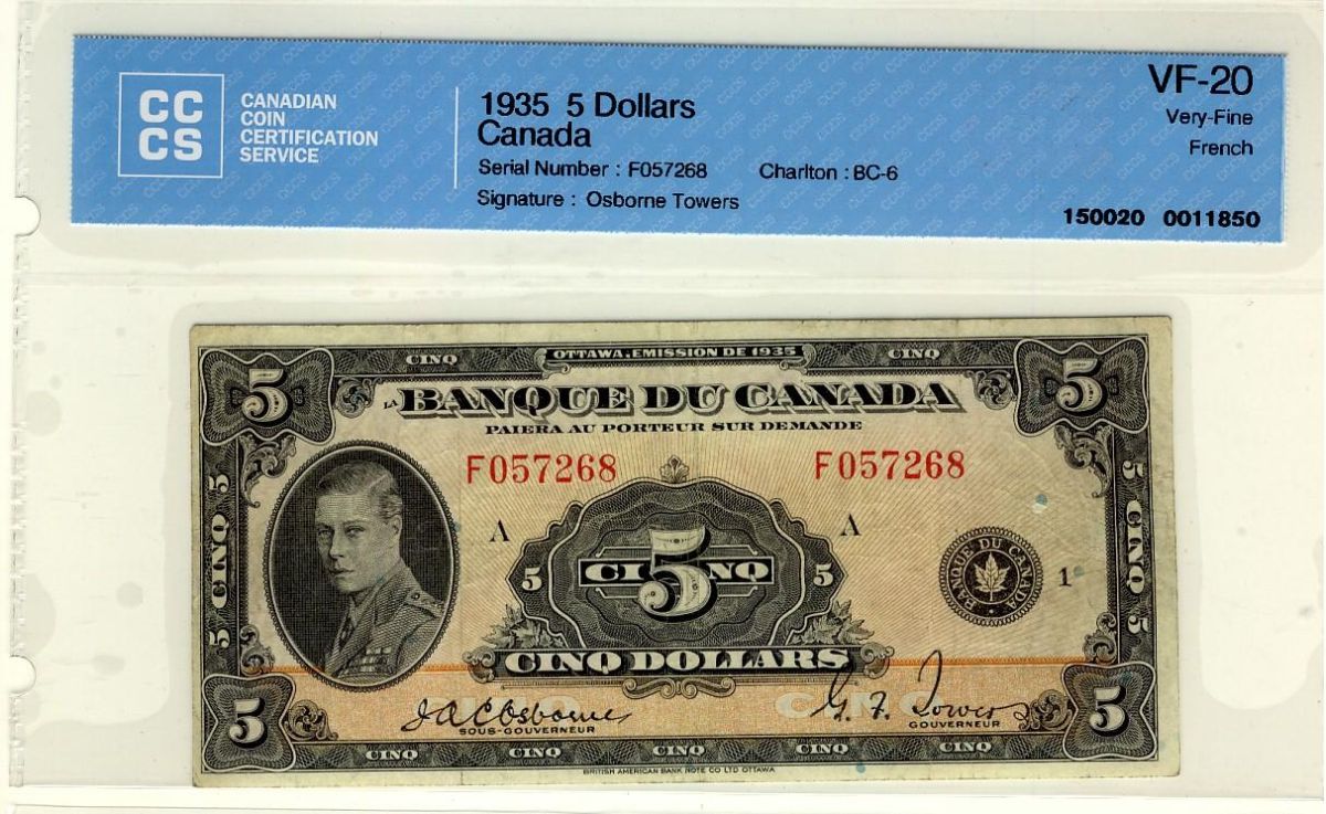 1935 $5 BC-6 #F057268. CCCS VF20.