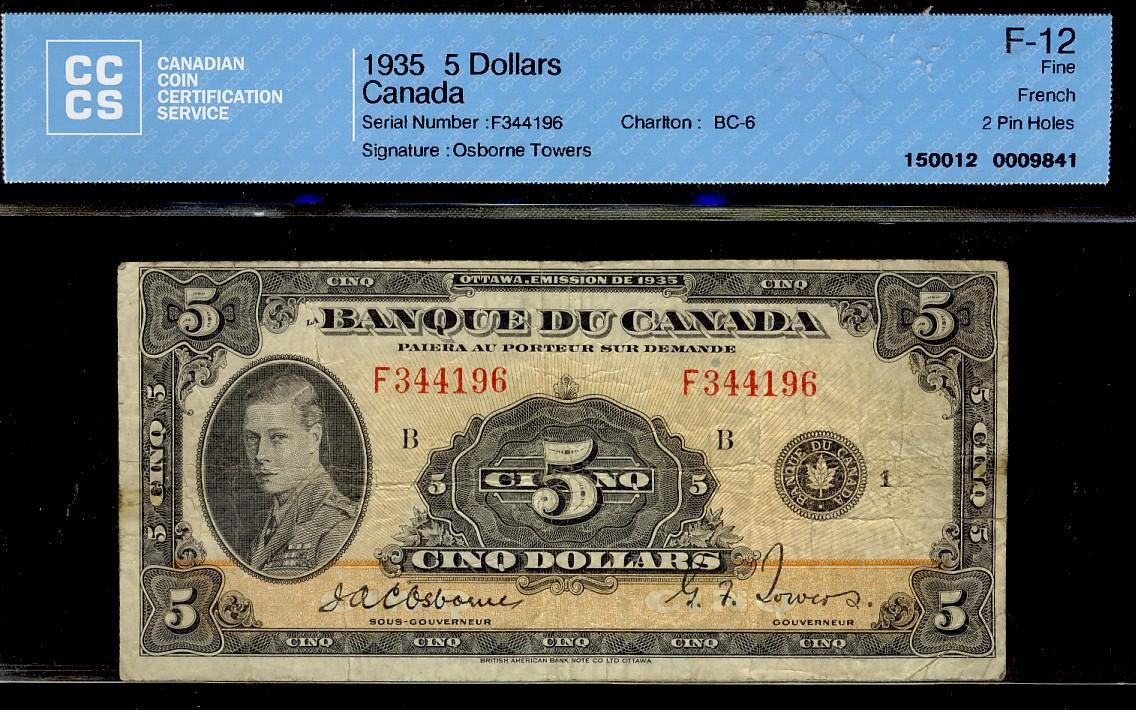 1935 $5 BC-6 #F344196 CCCS F12. 2 pinholes.