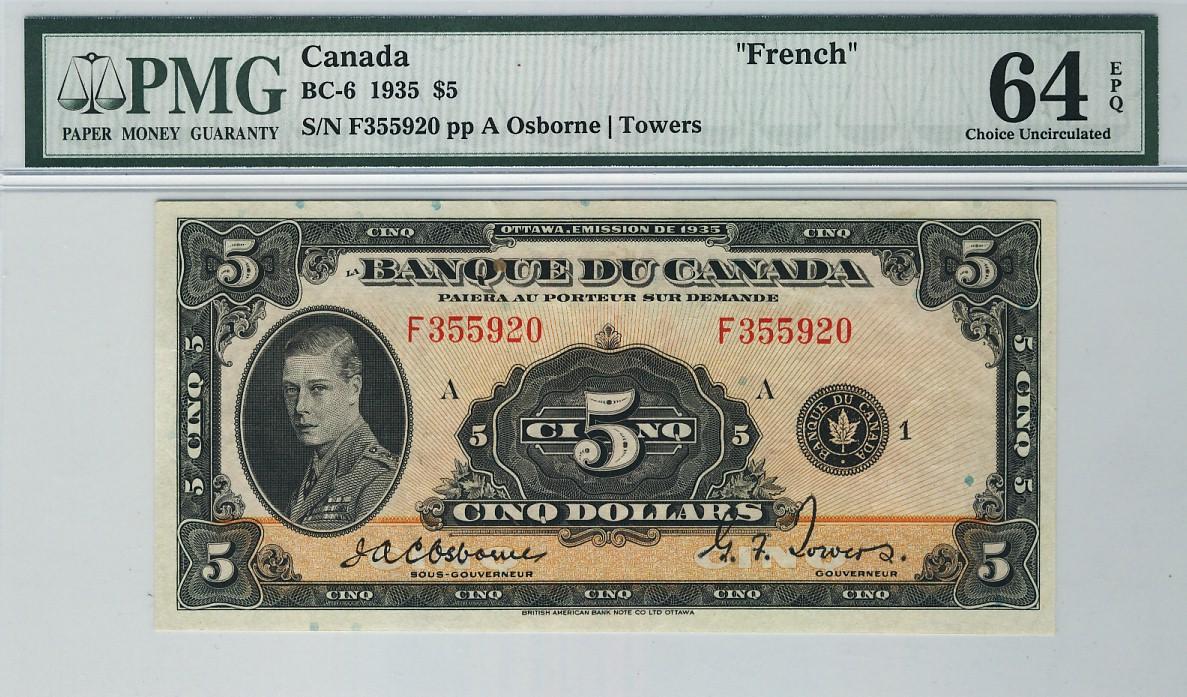 1935 $5 BC-6 #F355920, PMG CH UNC64EPQ Well centered and very bright. A superb example of this very sought after issue.