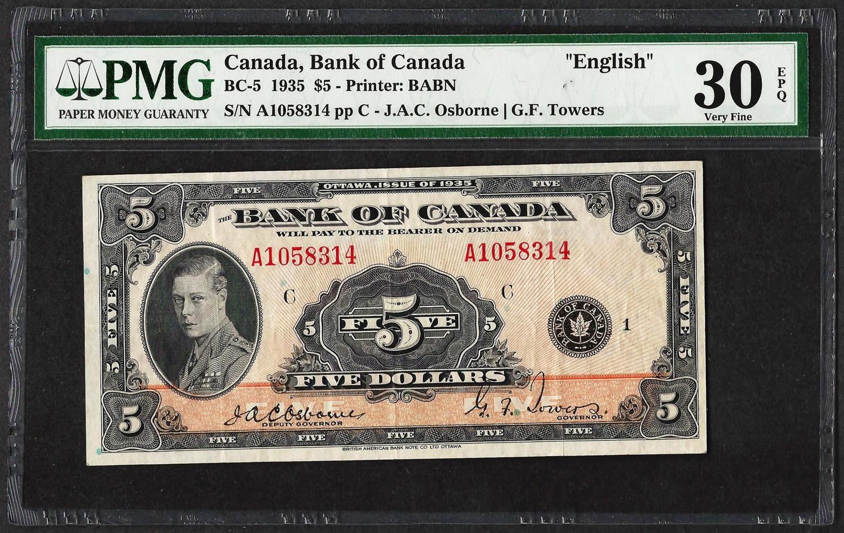 One 1935 $5 Bank of Canada English BC-5 PMG Very Fine 30EPQ. PMG Certified.