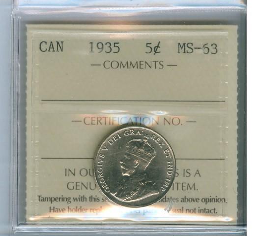 1935 5¢ ICCS MS63. Lustrous coin.