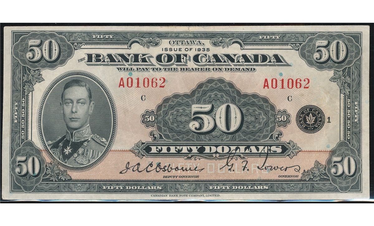 1935 $50 BC-13 #A01062, CCCS EF45. Nice bright example with sharp bright colours.