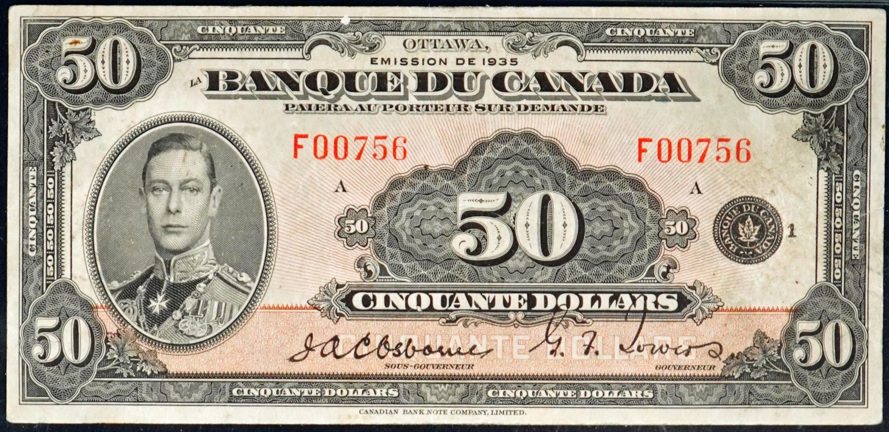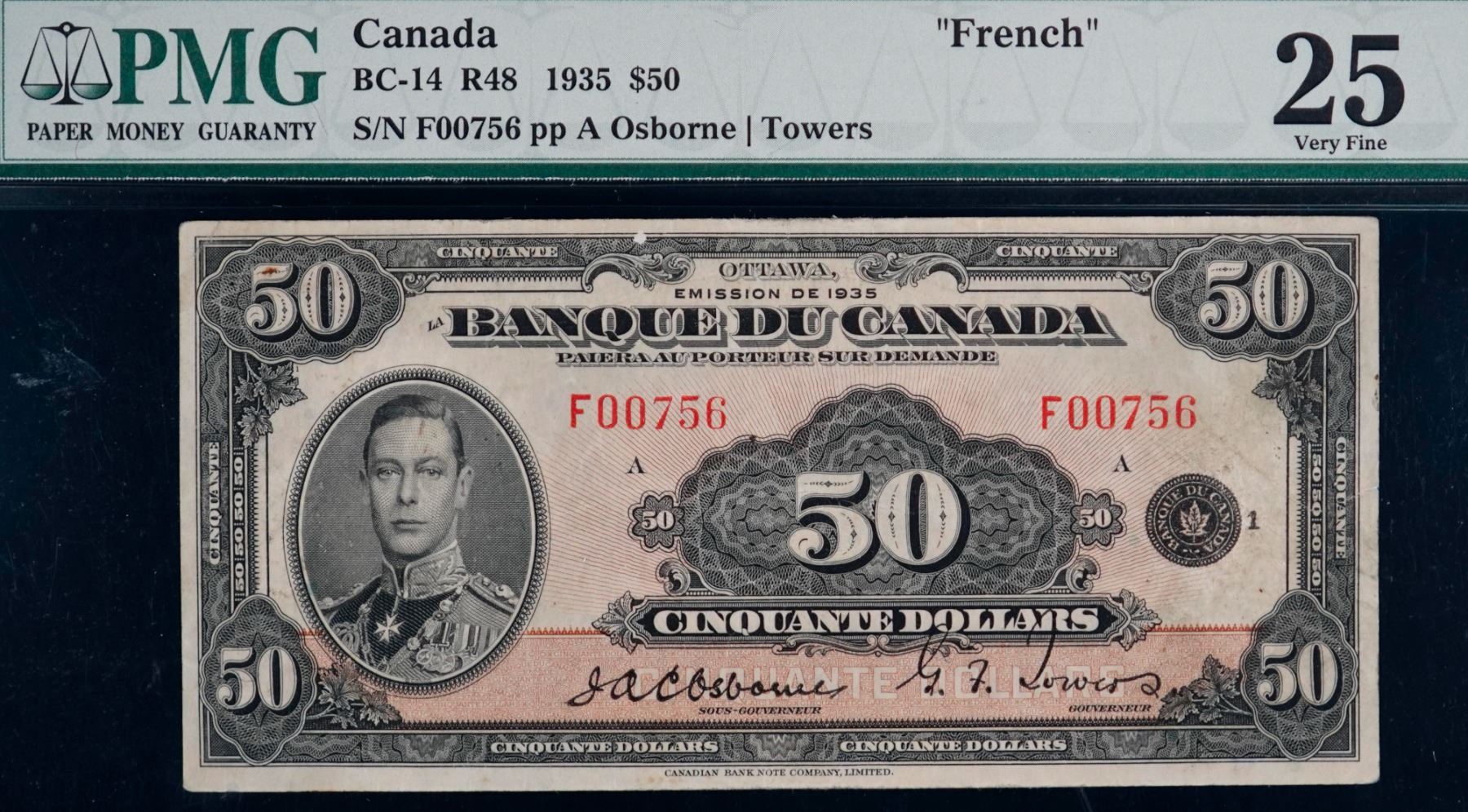 1935 $50 BC-14 #F00756 PMG Choice Very Fine-25 with issue. Rare French issue.