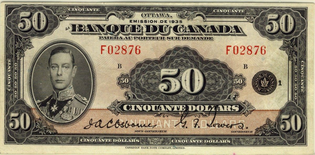 1935 $50 BC-14 #F02876 PPCGS AU50. Very well centered with great colours. Looks Uncirculated. A very flashy and desirable example. Excessively scarce and worth a premium bid.