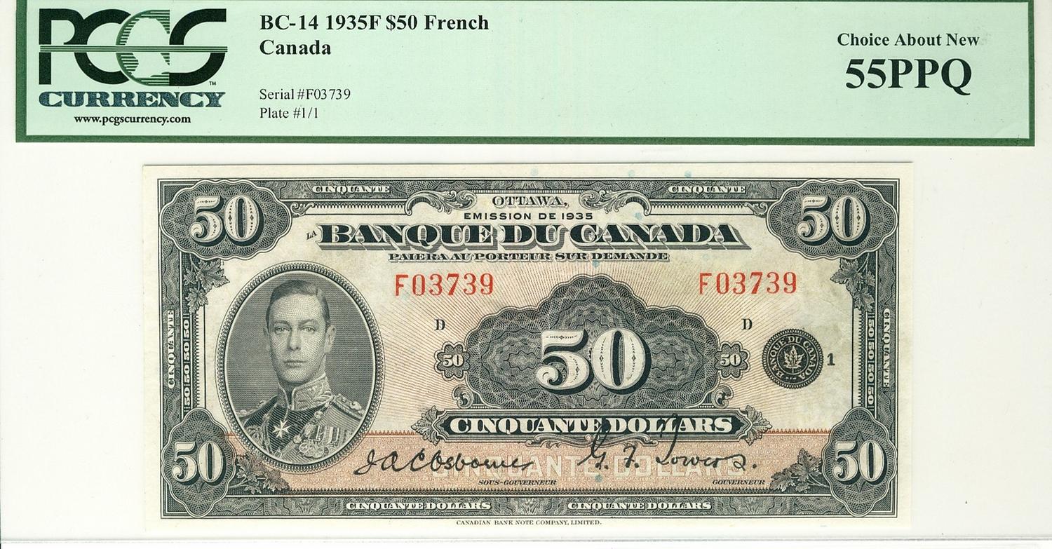 1935 $50 BC-14 #F03739 PCGS AU55PPQ. Wow. Very rare example. Choice with vibrant colours. Worth a premium bid.
