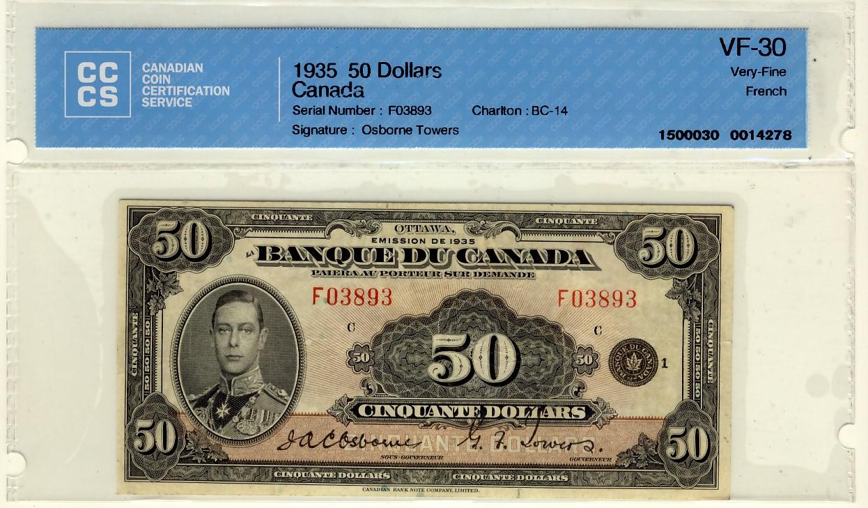 1935 $50 BC-14 #F03893 CCCS VF30. Rare French note. Affordable example. Very clean.