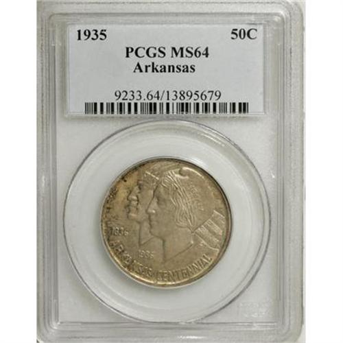 <B>1935 50C Arkansas MS64 PCGS.</B></I> PCGS Population (560/592). NGC Census: (391/418). Mintage: 13,012. Numismedia Wsl. Price for NGC/PCGS coin in MS64: $95. (#9233)<BR><I>From The Frank DuVall Collection of U.S. Commemoratives.</B></I><BR><BR><b>Shipping:</b> Coins & Currency (<a target="_blank" href="http://www.heritageauctions.com/common/shipping.php">view shipping information</a>\)