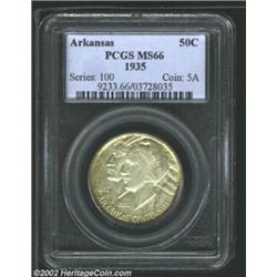 1935 50C Arkansas MS66 PCGS. The otherwise dove-gray surfaces exhibit irregular russet-copper shadings mainly near the peripheries, a small amount of which strays onto the obverse fields and devices. A relatively smooth Gem with crisply detailed features. There are several slight marks on Liberty's cheek, but they are not easily seen without a magnifying glass. Important notice: We expect to be auctioning lots at the rate of 200-250 per hour. Sometimes eBay Premier live bid software cannot keep up with that pace, so we strongly recommend that you place a realistic proxy bid now as insurance to avoid disappointment. Also please note that all Heritage/CAA lots purchased through eBay Premier carry a 20% Buyer's Premium. Please make sure you read the Terms and Conditions.