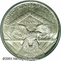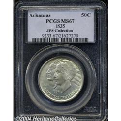 <B>1935<50C> Arkansas MS67 PCGS.</B></I> Bright and essentially untoned overall with a bold strike for this often weak issue. Just a hint of silver-gray color is seen as the coin is rotated under a light. Surface marks and abrasions are all but lacking on this amazingly well preserved Superb example. Population: 9 in 67, 0 finer (6/04).<BR><I>From the JFS Collection, the #1 All-Time PCGS Registry Set.</B></I> <BR><BR><B>Important notice:</B> Heritage usually auctions material at the rate of 200-250 lots per hour. On some occasions eBay Live bid software or the Internet may not be able to keep up with the pace of the auction. We recommend placing a realistic absentee bid now as insurance to avoid disappointment. Occasionally the auctioneer may eliminate or reject an eBay Live bid, and the auctioneer may also reopen a lot after the close of the eBay live bidding (usually because we missed an audience bid), and may reject your bid even if it shows you as the winning bidder. By bidding via eBay Live, you agree that Heritage may award the lot to another bidder at its sole discretion under the circumstances described above or any other reasonable circumstances. Since eBay bids are not shown to us until we open the lot on the floor, we treat those bids just like floor bids. In most cases the floor responds before the eBay bid is presented to us, due to Internet lag time, so for consistency we have made it a policy that floor bids are always considered first over tie eBay live bids. Also please note that all Heritage lots purchased through eBay Live carry a 20% Buyer's Premium. Please make sure you read the Terms and Conditions before you bid. </span></font></tr></table></td></tr></table>
