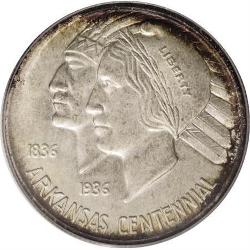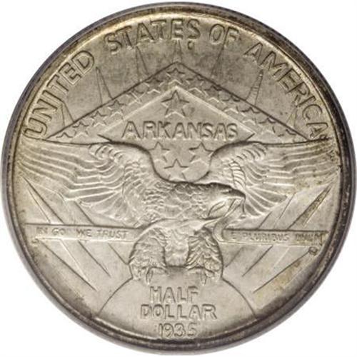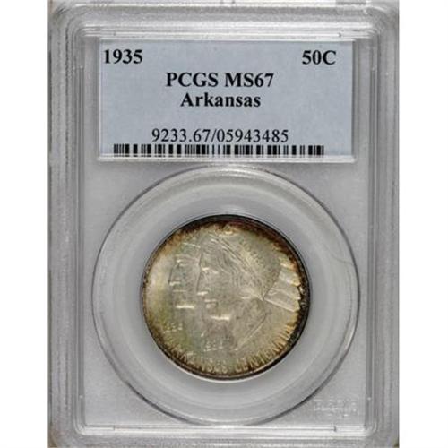 <B>1935 50C Arkansas MS67 PCGS.</B></I> The Arkansas commemorative series is one of several designs that spanned a number of years from the 1920s to the 1950s. Each of these series offer examples from all three mints, in some instances incorporating low mintages that created instant rarities. This piece has rich mint luster and is overlaid by ivory color with peripheral burgundy toning. Population: 10 in 67, 0 finer (5/07).<BR><BR><b>Shipping:</b> Coins & Currency (<a target="_blank" href="http://www.heritageauctions.com/common/shipping.php">view shipping information</a>)