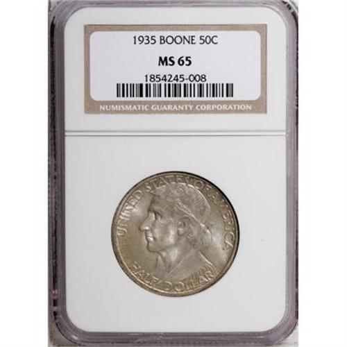 <B>1935 50C Boone MS65 NGC.</B></I> NGC Census: (421/178). PCGS Population (489/211). Mintage: 10,000. Numismedia Wsl. Price for NGC/PCGS coin in MS65: $220. (#9258)<BR><I>From The Frank DuVall Collection of U.S. Commemoratives.</B></I><BR><BR><b>Shipping:</b> Coins & Currency (<a target="_blank" href="http://www.heritageauctions.com/common/shipping.php">view shipping information</a>\)