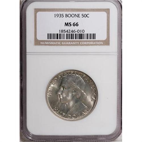 <B>1935 50C Boone MS66 NGC.</B></I> NGC Census: (155/23). PCGS Population (182/29). Mintage: 10,000. Numismedia Wsl. Price for NGC/PCGS coin in MS66: $344. (#9258)<BR><I>From The Frank DuVall Collection of U.S. Commemoratives.</B></I><BR><BR><b>Shipping:</b> Coins & Currency (<a target="_blank" href="http://www.heritageauctions.com/common/shipping.php">view shipping information</a>\)