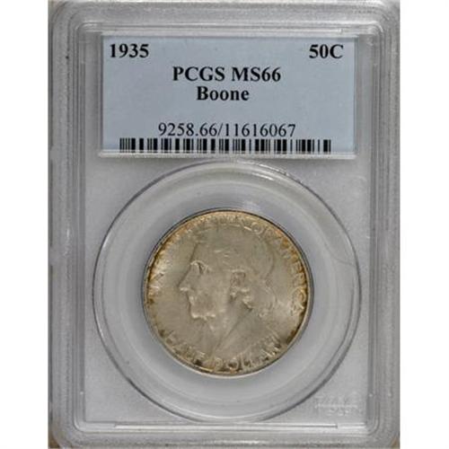 <B>1935 50C Boone MS66 PCGS.</B></I> PCGS Population (182/29). NGC Census: (155/23). Mintage: 10,000. Numismedia Wsl. Price for NGC/PCGS coin in MS66: $344. (#9258)<BR><BR><b>Shipping:</b> Coins & Currency (<a target="_blank" href="http://www.heritageauctions.com/common/shipping.php">view shipping information</a>\)