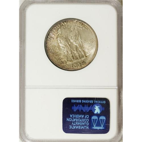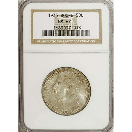 <B>1935 50C Boone MS67 NGC.</B></I> Soft rose patina graces much of the otherwise steel-gray surfaces. At the upper left reverse, the color deepens to crimson-plum. A satiny and carefully preserved Superb Gem, one of 10,010 pieces struck for this second-year Philadelphia issue. NGC has awarded just one numerically finer grade (4/07).<BR><I>From The Cary & Cheryl Porter Collection.</B></I><BR><BR><b>Shipping:</b> Coins & Currency (<a target="_blank" href="http://www.heritageauctions.com/common/shipping.php">view shipping information</a>)