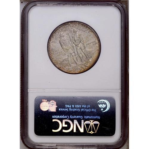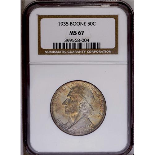 "1935 50C Boone MS67 NGC. Yellow-gold, s"