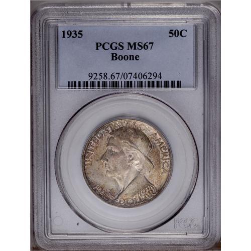 "1935 50C Boone MS67 PCGS. Speckled red,"