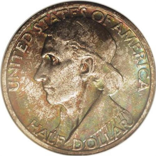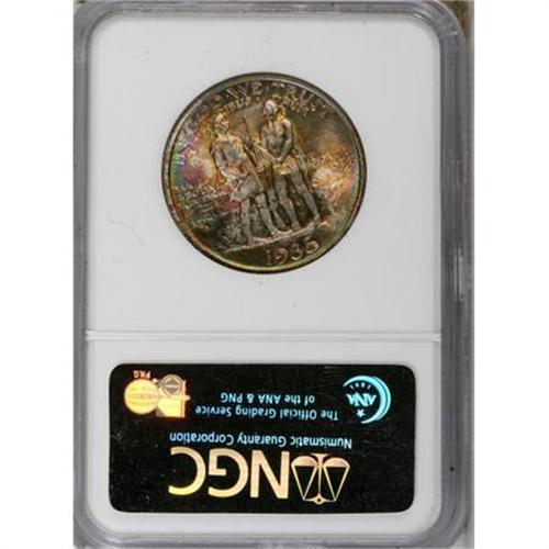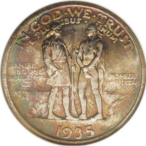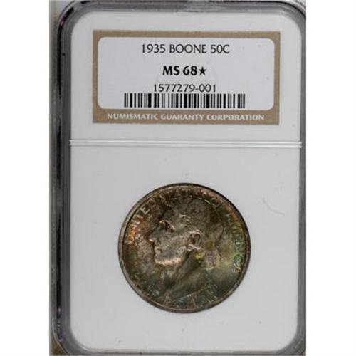 <B>1935 50C Boone MS68 </B></I> S<B> NGC.</B></I> With a mintage of 10,000 pieces plus assay coins, the 1935 is one of the more available Boone issues, though few classic commemoratives of any design are so exquisitely preserved and eminently appealing as the one offered here. Dappled lime, rose, orange, and silver-gray toning graces both sides, while the reverse has an additional element of blue-green at the left margin. NGC has graded just two 1935 Boone commemoratives as MS68, and only this example received the Star Designation (8/07).<BR><BR><b>Shipping:</b> Coins & Currency (<a target="_blank" href="http://www.heritageauctions.com/common/shipping.php">view shipping information</a>)