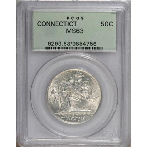 <B>1935 50C Connecticut MS63 PCGS.</B></I> PCGS Population (763/2910). NGC Census: (231/2601). Mintage: 25,018. Numismedia Wsl. Price for NGC/PCGS coin in MS63: $252. (#9299)<BR><BR><b>Shipping:</b> Coins & Currency (<a target="_blank" href="http://www.heritageauctions.com/common/shipping.php">view shipping information</a>\)