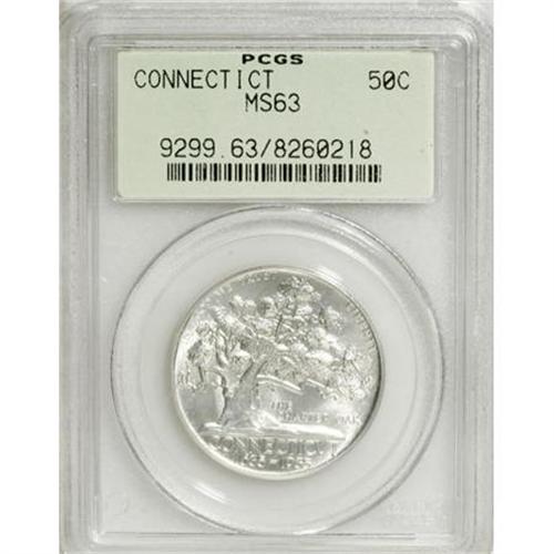 <B>1935 50C Connecticut MS63 PCGS.</B></I> . PCGS Population (762/2964). NGC Census: (233/2641). Mintage: 25,018. Numismedia Wsl. Price for NGC/PCGS coin in MS63: $252. (#9299)<BR><BR><b>Shipping:</b> Coins & Currency (<a target="_blank" href="http://www.heritageauctions.com/common/shipping.php">view shipping information</a>)