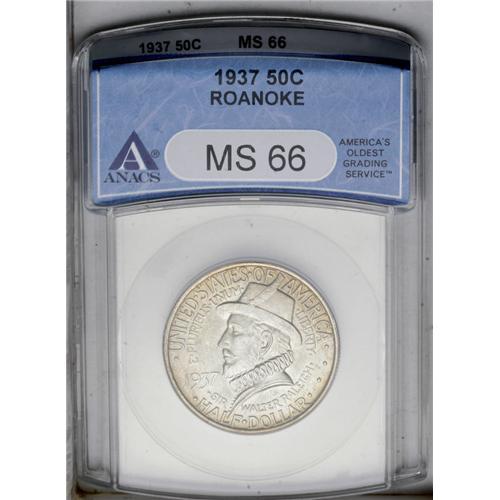 <B>1935<50C> Connecticut MS64 ANACS,</B></I> blended cream-gray and chestnut toning; <B>1936-D Rhode Island MS66 ANACS,</B></I> gentle steel-blue and tan patina; and a <B>1937 Roanoke MS66 ANACS,</B></I> apricot and rose hues adorn lustrous and smooth surfaces.