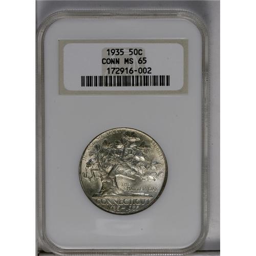<B>1935<50C> Connecticut MS65 NGC.</B></I> Light apricot-gray patina confirms the originality of this lustrous and unblemished Gem. Housed in a prior generation holder.