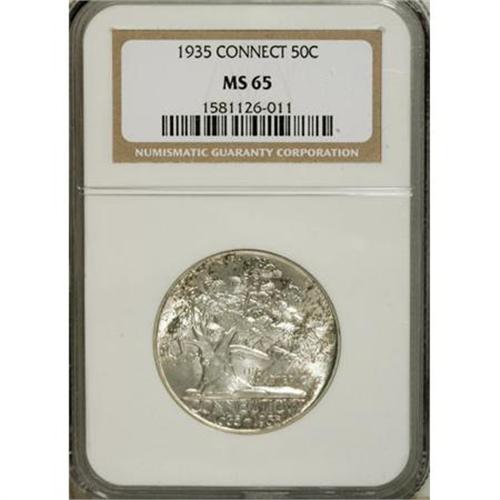 <B>1935 50C Connecticut MS65 NGC.</B></I> NGC Census: (1149/404). PCGS Population (1023/470). Mintage: 25,018. Numismedia Wsl. Price for NGC/PCGS coin in MS65: $420. (#9299)<BR><BR><b>Shipping:</b> Coins & Currency (<a target="_blank" href="http://www.heritageauctions.com/common/shipping.php">view shipping information</a>)