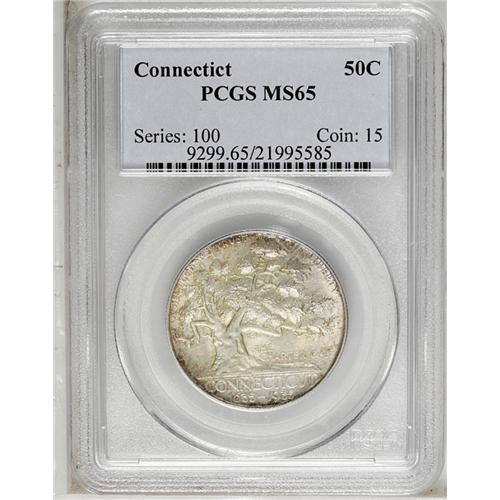 <B>1935<50C> Connecticut MS65 PCGS.</B></I> Lavender and sunset-orange converge in the patina of this Art Deco commemorative. Solidly struck and lustrous, with dark toning noted on the obverse between 5 and 9 o'clock.