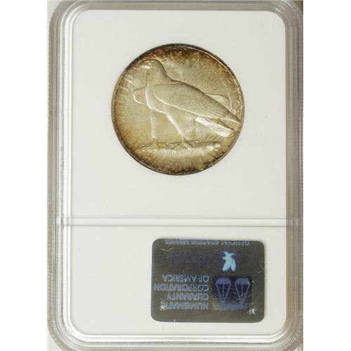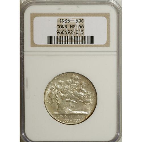<B>1935 50C Connecticut MS66 NGC.</B></I> The venerable Charter Oak, more than 500 years old when a patriot hid the Royal Charter inside it in 1687 to prevent its seizure by representatives of Britain's King James II, stood as a symbol of Connecticut for another 170 years until it was toppled during a storm on Aug. 21, 1856. The revered old tree and the modernistic eagle on the reverse make an odd pairing. This piece displays lightly patinated silver-gray surfaces with a ring of magenta and gold on the reverse. A few stray nicks are noted on the tree base.<BR><I>From The Cary & Cheryl Porter Collection.</B></I><BR><BR><b>Shipping:</b> Coins & Currency (<a target="_blank" href="http://www.heritageauctions.com/common/shipping.php">view shipping information</a>)