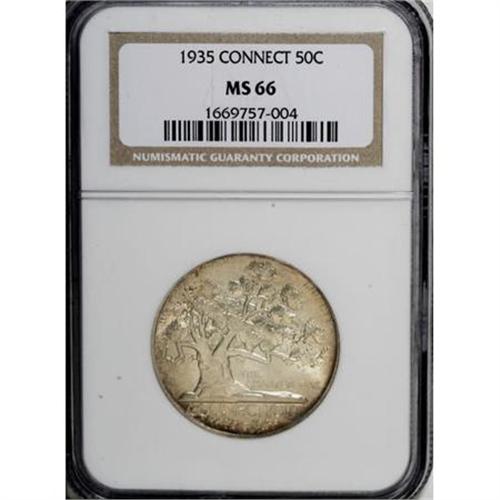 <B>1935 50C Connecticut MS66 NGC.</B></I> One of the most distinctive and universally praised commemorative designs, the Connecticut has a crisp, modern design that remains appealing to this day. The well-defined Premium Gem offered here has shining, swirling luster and layers of gold and rose patina over much of the surfaces.<BR><I>From The Cary & Cheryl Porter Collection, Part Three.</B></I><BR><BR><b>Shipping:</b> Coins & Currency (<a target="_blank" href="http://www.heritageauctions.com/common/shipping.php">view shipping information</a>\)
