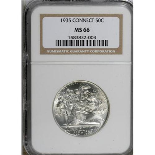 <B>1935 50C Connecticut MS66 NGC.</B></I> A radiant, frosty sheen envelopes each side of this brilliant Premium Gem. Some of the design elements are a bit softly defined, but surface marks are minimal. An alluring example of the Connecticut Tercentenary commemorative. <BR><BR><b>Shipping:</b> Coins & Currency (<a target="_blank" href="http://www.heritageauctions.com/common/shipping.php">view shipping information</a>)