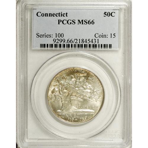 <B>1935 50C Connecticut MS66 PCGS.</B></I> Delicate canary-yellow toning graces the peripheral zones, while a hint of ice-blue is noted over the centers. A sharply struck and exceptionally well-preserved representative of this classic commemorative issue.<BR><BR><b>Shipping:</b> Coins & Currency (<a target="_blank" href="http://www.heritageauctions.com/common/shipping.php">view shipping information</a>)