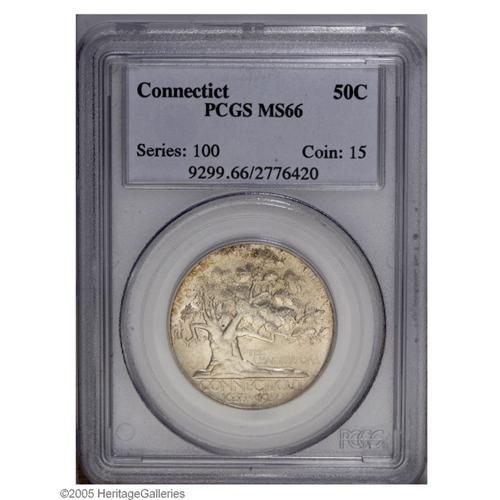 <B>1935<50C> Connecticut MS66 PCGS.</B></I> Original light golden-gray colors endow this lustrous and meticulously struck premium Gem. A nearly immaculate example of this well designed statehood issue.