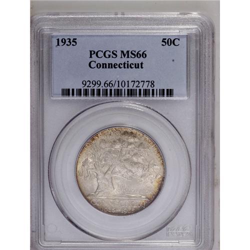 <B>1935<50C> Connecticut MS66 PCGS.</B></I> Radiantly lustrous surfaces are visited by pastel mauve-gray patina accented with golden-orange at the obverse borders. The design elements are well impressed, and there are no significant marks to report.