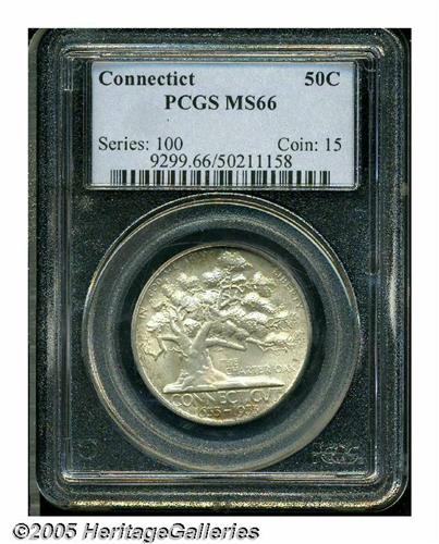 <B>1935<50C> Connecticut MS66 PCGS.</B></I> This is a frosty Gem with light champagne and iridescent toning over frosty luster. Few finer examples have been certified by PCGS. MS66 is perhaps the optimum grade for this issue, with attractive examples for the grade being in particular demand. Population: 368 in 66, 39 finer (5/05).