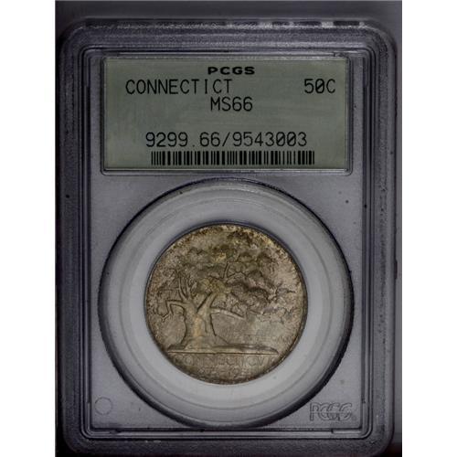 <B>1935 50C Connecticut MS66 PCGS.</B></I> Warm light to medium gray toning is imbued with occasional russet speckles. The lustrous surfaces are impeccably preserved, and exhibit sharply struck design features. Only 41 pieces have been graded higher by PCGS (1/06).