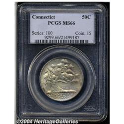 <B>1935<50C> Connecticut MS66 PCGS.</B></I> Pastel tinged colors adorn both sides of this lustrous and beautiful example. The eye appeal alone easily supports the MS66 designation, to say nothing of the strong technical merits. <BR><BR><B>Important notice:</B> Heritage usually auctions material at the rate of 200-250 lots per hour. On some occasions eBay Live bid software or the Internet may not be able to keep up with the pace of the auction. We recommend placing a realistic absentee bid now as insurance to avoid disappointment. Occasionally the auctioneer may eliminate or reject an eBay Live bid, and the auctioneer may also reopen a lot after the close of the eBay live bidding (usually because we missed an audience bid), and may reject your bid even if it shows you as the winning bidder. By bidding via eBay Live, you agree that Heritage may award the lot to another bidder at its sole discretion under the circumstances described above or any other reasonable circumstances. Since eBay bids are not shown to us until we open the lot on the floor, we treat those bids just like floor bids. In most cases the floor responds before the eBay bid is presented to us, due to Internet lag time, so for consistency we have made it a policy that floor bids are always considered first over tie eBay live bids. Also please note that all Heritage lots purchased through eBay Live carry a 20% Buyer's Premium. Please make sure you read the Terms and Conditions before you bid.