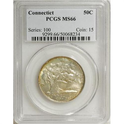 <B>1935 50C Connecticut MS66 PCGS.</B></I> Yellow-gold and amber peripheral toning enlivens the obverse, while the reverse shows a patch of carrot-orange on and above the eagle's wing. Strongly lustrous and immensely appealing. PCGS has graded only 43 finer pieces (10/07).<BR><BR><b>Shipping:</b> Coins & Currency (<a target="_blank" href="http://www.heritageauctions.com/common/shipping.php">view shipping information</a>)