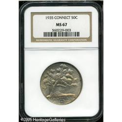 <B>1935 50C Connecticut MS67 NGC.</B></I> Fully struck with glowing luster and absolutely splendid champagne-rose and speckled russet patina, on both obverse and reverse. Well preserved, with just a couple of minor marks on the reverse, and a scarce, simply outstanding Superb Gem. Population: 32 in 67, 1 finer (1/05). Lot:8488