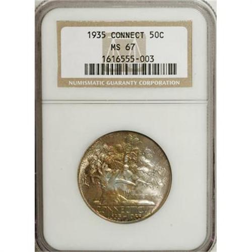 <B>1935 50C Connecticut MS67 NGC.</B></I> Rich peach, sky-blue, and gold endow this lustrous and lovely Superb Gem. Very scarce in such exceptional quality. The Charter Oak, felled by a storm in 1856, also appeared on the 1999 Connecticut state quarter. Census: 54 in 67, 1 finer (6/07).<BR><I>From The Cary & Cheryl Porter Collection, Part Three.</B></I><BR><BR><b>Shipping:</b> Coins & Currency (<a target="_blank" href="http://www.heritageauctions.com/common/shipping.php">view shipping information</a>\)