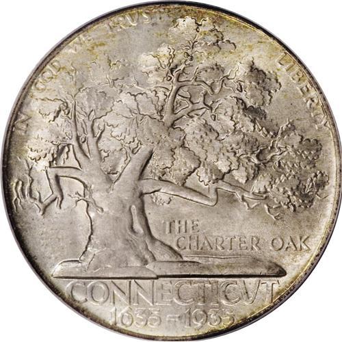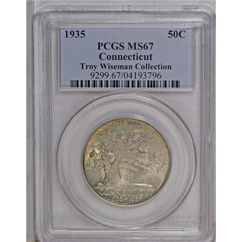<B>1935<50C> Connecticut MS67 PCGS.</B></I> The Charter Oak was where officials of the Connecticut Colony in 1687 secreted the colony's Royal Charter (or perhaps a copy, according to an alternative version of the legend) to keep it away from a representative of King James II. Since the king had consolidated several former colonies into the Dominion of New England to lessen their individual power and to exert firmer control, his representative felt that reclaiming the Connecticut charter (and those of other former colonies) would have actual and symbolic value.<BR> This Superb Gem half dollar offers gold luster and light gray-gold surfaces, with tinges of sunset-gold, jade-green, and carmine at the rims on both sides. PCGS has graded a single specimen finer (7/06).<BR><I>From The Troy Wiseman Collection.</B></I>