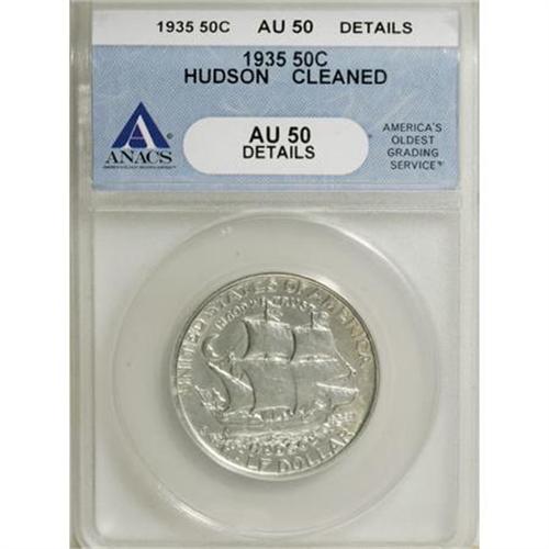 <B>1935 50C Hudson--Cleaned--ANACS AU50 Details.</B></I> NGC Census: (0/1727). PCGS Population (1/2727). Mintage: 10,008. Numismedia Wsl. Price for NGC/PCGS coin in AU50: $575. (#9312)<BR><BR><b>Shipping:</b> Coins & Currency (<a target="_blank" href="http://www.heritageauctions.com/common/shipping.php">view shipping information</a>)