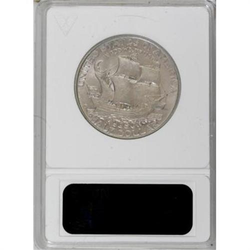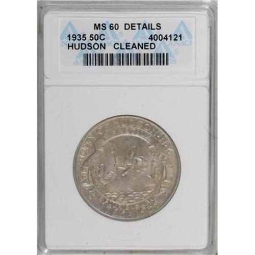 <B>1935 50C Hudson--Cleaned--ANACS. MS60 Details.</B></I> An unworn representative of this challenging local-interest issue, well struck with delicate blue, violet, and gold retoning over suspiciously subdued surfaces. Faintly hairlined but appealing nonetheless.<BR><BR><b>Shipping:</b> Coins & Currency (<a target="_blank" href="http://www.heritageauctions.com/common/shipping.php">view shipping information</a>)