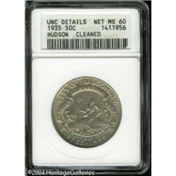 1935 50C Hudson--Cleaned--ANACS. Unc Details, Net MS <B>1935 50C Hudson--Cleaned--ANACS. Unc Details, Net MS60.</B></I> Silver-gray surfaces reveal faint hairlines. Nicely struck, with no major contact marks. <BR><BR><B>Important notice:</B> Heritage usually auctions material at the rate of 200-250 lots per hour. On some occasions eBay Live bid software or the Internet may not be able to keep up with the pace of the auction. We recommend placing a realistic absentee bid now as insurance to avoid disappointment. Occasionally the auctioneer may eliminate or reject an eBay Live bid, and the auctioneer may also reopen a lot after the close of the eBay live bidding (usually because we missed an audience bid), and may reject your bid even if it shows you as the winning bidder. By bidding via eBay Live, you agree that Heritage may award the lot to another bidder at its sole discretion under the circumstances described above or any other reasonable circumstances. Since eBay bids are not shown to us until we open the lot on the floor, we treat those bids just like floor bids. In most cases the floor responds before the eBay bid is presented to us, due to Internet lag time, so for consistency we have made it a policy that floor bids are always considered first over tie eBay live bids. Also please note that all Heritage lots purchased through eBay Live carry a 20% Buyer's Premium. Please make sure you read the Terms and Conditions before you bid. This lot is being auctioned in conjunction with a live floor auction by Heritage Galleries & Auctioneers. All final auction and invoice information will be supplied by Heritage Galleries & Auctioneers, and all other information should be considered preliminary. Lot:7898