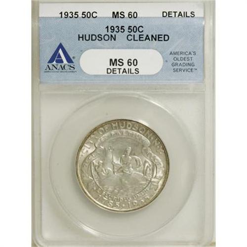 <B>1935 50C Hudson--Cleaned--ANACS. MS60 Details.</B></I> The central obverse has faint horizontal hairlines, and equally delicate vertical hairlines are present on the sails. Nonetheless, a lustrous pearl-gray example of this low mintage type.<BR><BR><b>Shipping:</b> Coins & Currency (<a target="_blank" href="http://www.heritageauctions.com/common/shipping.php">view shipping information</a>)
