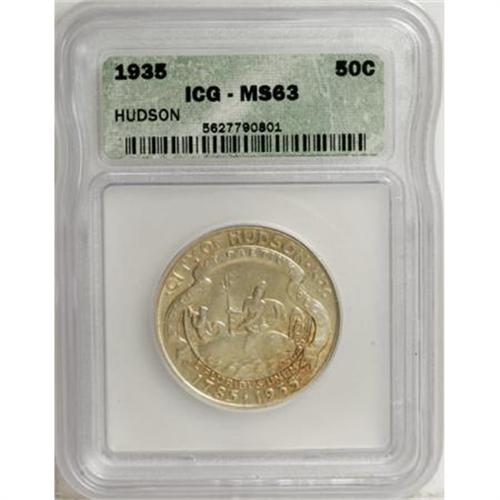 <B>1935 50C Hudson MS63 ICG.</B></I> A subtly lustrous and well struck Select example of this lower-mintage local-interest classic commemorative. The silver-gray surfaces show scattered elements of golden-tan and orange.<BR><BR><b>Shipping:</b> Coins & Currency (<a target="_blank" href="http://www.heritageauctions.com/common/shipping.php">view shipping information</a>)