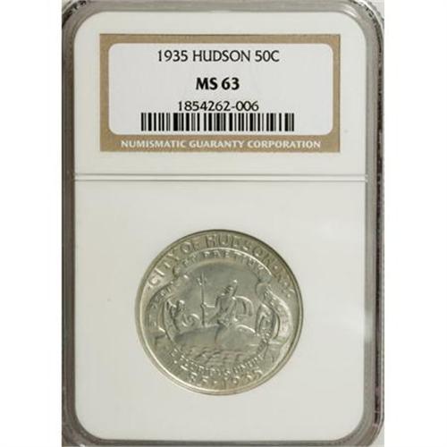 <B>1935 50C Hudson MS63 NGC.</B></I> NGC Census: (242/1373). PCGS Population (628/1825). Mintage: 10,008. Numismedia Wsl. Price for NGC/PCGS coin in MS63: $790. (#9312)<BR><I>From The Frank DuVall Collection of U.S. Commemoratives.</B></I><BR><BR><b>Shipping:</b> Coins & Currency (<a target="_blank" href="http://www.heritageauctions.com/common/shipping.php">view shipping information</a>\)