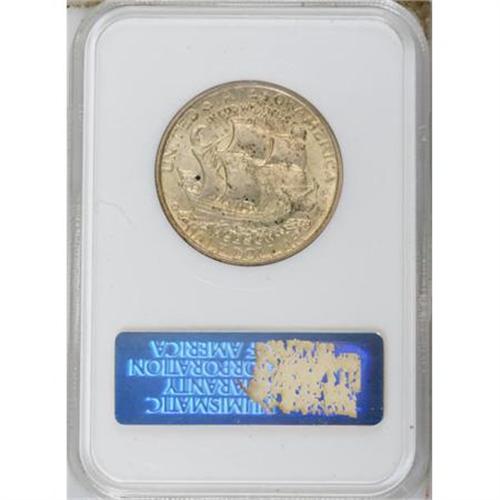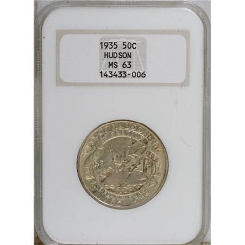 <B>1935 50C Hudson MS63 NGC.</B></I> Powder-blue and sun-gold patina endows this satiny and unmarked low mintage commemorative. A small spot near the left-side flag is the sole detraction. In an older generation holder.<BR><BR><b>Shipping:</b> Coins & Currency (<a target="_blank" href="http://www.heritageauctions.com/common/shipping.php">view shipping information</a>)