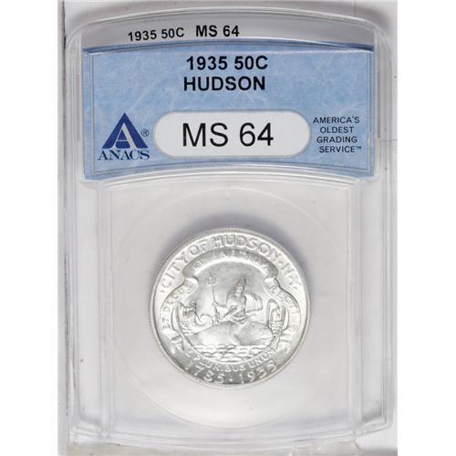 <B>1935<50C> Hudson MS64 ANACS.</B></I> A fully brilliant example with satiny silver luster and no evidence of toning. The Hudson commemorative half dollar was a low-mintage variety with 10,008 coins struck, the odd eight pieces reserved for assay purposes.